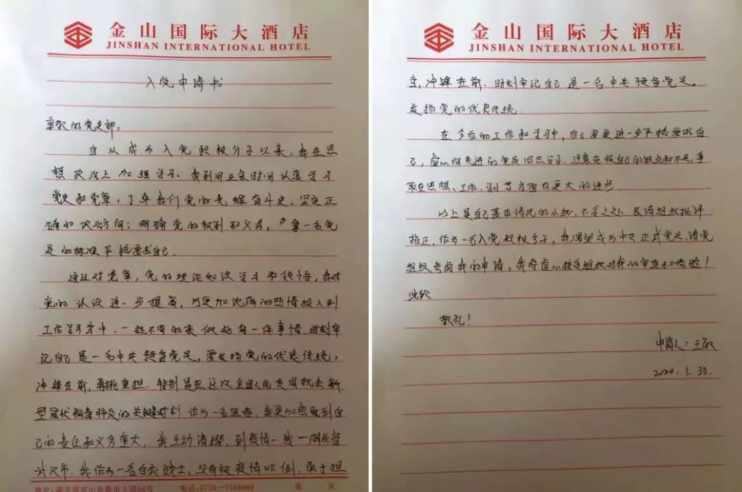 1月30日,在武漢戰(zhàn)“疫”第一線,短短的兩天,讓青年護(hù)士王敏、王曉霞最驚訝、最感動(dòng)的就是防控疫情黨員先行,最危急的關(guān)頭、最危險(xiǎn)的地方總有共產(chǎn)黨員沖在前面,“我是黨員我先上”成為最響亮的口號(hào)。到達(dá)武漢的第二天,她們就向內(nèi)蒙古衛(wèi)健委成立的援助武漢臨時(shí)黨支部遞交了入黨申請(qǐng)書(shū)。她們表示,要在武漢防疫一線努力工作,向黨員同志學(xué)習(xí)、看齊,以實(shí)際行動(dòng)早日成為一名正式的共產(chǎn)黨員!