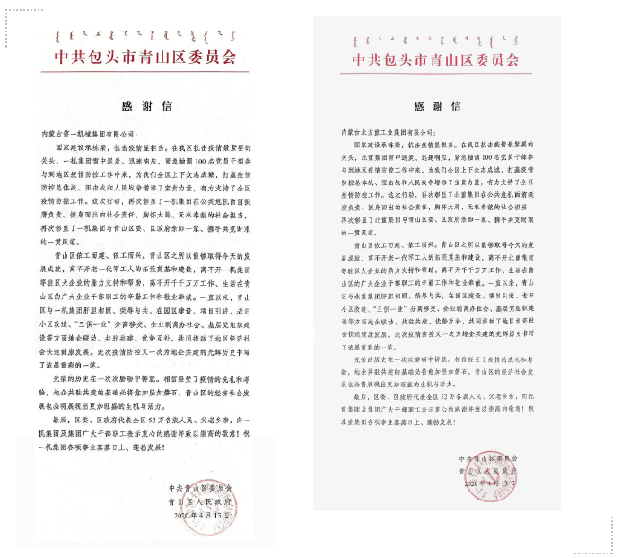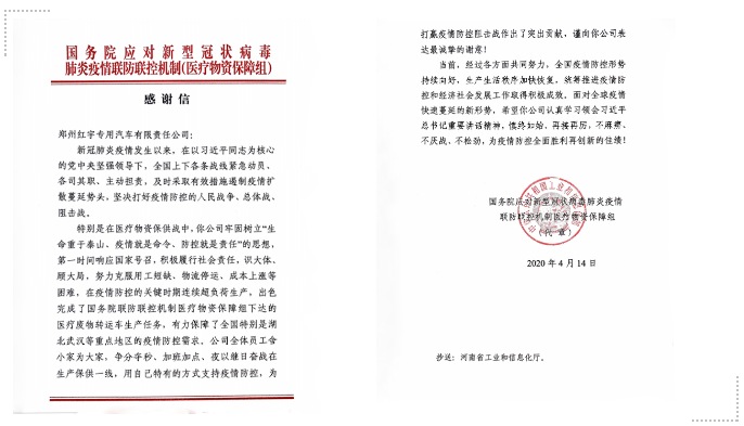 近日,中國兵器工業(yè)集團豫西集團鄭州紅宇專汽公司、一機集團和北重集團分別收到國務(wù)院應(yīng)對新型冠狀病毒肺炎疫情聯(lián)防聯(lián)控機制醫(yī)療物資保障組,包頭市青山區(qū)委、區(qū)政府發(fā)來的感謝信、慰問信,對他們在打贏疫情防控人民戰(zhàn)爭、總體戰(zhàn)、阻擊戰(zhàn)中作出的貢獻表示感謝。 豫西集團鄭州紅宇專汽公司收到國務(wù)院聯(lián)防聯(lián)控機制感謝信 4月14日,國務(wù)院應(yīng)對新型冠狀病毒肺炎疫情聯(lián)防聯(lián)控機制醫(yī)療物資保障組向中國兵器工業(yè)集團豫西集團鄭州紅宇專汽公司發(fā)來感謝信。 豫西集團鄭州紅宇專汽公司收到國務(wù)院應(yīng)對新型冠狀病毒肺炎疫情聯(lián)防聯(lián)控機制醫(yī)療物資保障組發(fā)來的感謝信 信中指出,新冠肺炎疫情發(fā)生以來,在以習近平同志為核心的黨中央堅強領(lǐng)導(dǎo)下,全國上下各條戰(zhàn)線緊急動員、各司其職、主動擔責,及時采取有效措施遏制疫情擴散蔓延勢頭,堅決打好疫情防控的人民戰(zhàn)爭、總體戰(zhàn)、阻擊戰(zhàn)。 特別是在醫(yī)療物資保供戰(zhàn)中,鄭州紅宇專汽公司牢固樹立“生命重于泰山、疫情就是命令、防控就是責任”的思想,第一時間響應(yīng)國家號召,積極履行社會責任,識大體、顧大局,努力克服用工短缺、物流停運、成本上漲等困難,在疫情防控的關(guān)鍵時期連續(xù)超負荷生產(chǎn),出色完成了國務(wù)院聯(lián)防聯(lián)控機制醫(yī)療物資保障組下達的醫(yī)療廢物轉(zhuǎn)運車生產(chǎn)任務(wù),有力保障了全國特別是湖北武漢等重點地區(qū)的疫情防控需求。公司全體員工舍小家為大家、爭分奪秒、加班加點,夜以繼日奮戰(zhàn)在生產(chǎn)保供一線,用自己特有的方式支持疫情防控,為打贏疫情防控阻擊戰(zhàn)作出了突出貢獻。 鄭州紅宇專汽公司緊急生產(chǎn)醫(yī)療廢物轉(zhuǎn)運車并及時發(fā)運 疫情發(fā)生以來,鄭州紅宇專汽公司已簽約醫(yī)療廢物轉(zhuǎn)運車107臺,累計下線90臺,交付83臺。 一機集團和北重集團收到中共包頭市青山區(qū)委員會、青山區(qū)人民政府發(fā)來的感謝信和慰問信 4月13日,中共包頭市青山區(qū)委員會、青山區(qū)人民政府向中國兵器工業(yè)集團一機集團和北重集團發(fā)來感謝信和慰問信,對參與青山區(qū)防控疫情一線工作的一機集團、北重集團黨員干部職工及給予充分理解、全力支持的家屬們,表示衷心的感謝并致以最崇高的敬意!