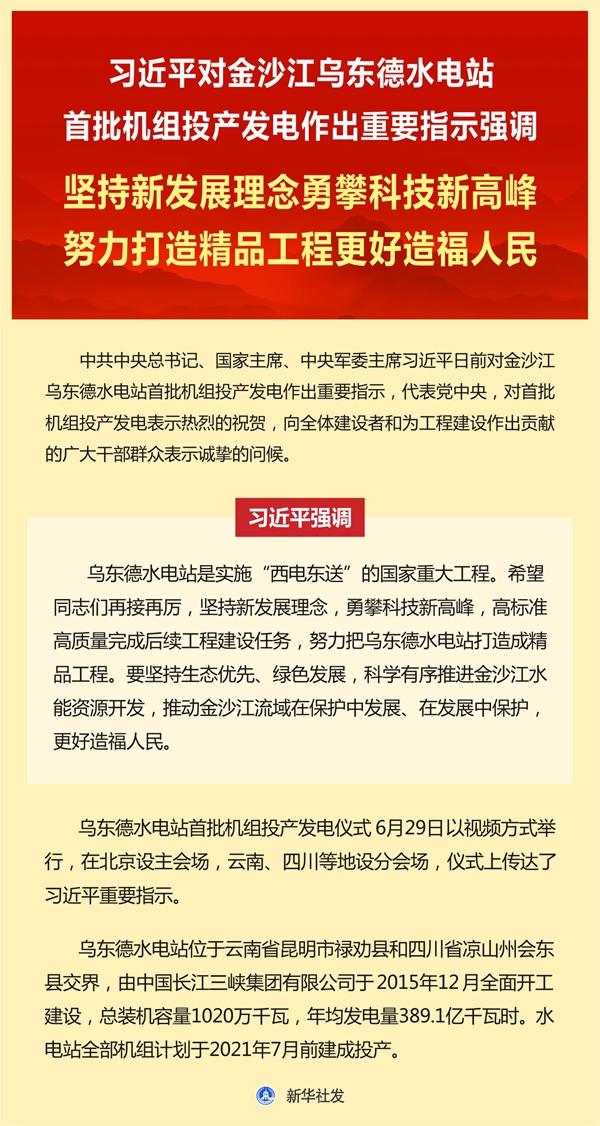 新華社北京6月29日電 中共中央總書記、國家主席、中央軍委主席習近平日前對金沙江烏東德水電站首批機組投產(chǎn)發(fā)電作出重要指示,代表黨中央,對首批機組投產(chǎn)發(fā)電表示熱烈的祝賀,向全體建設者和為工程建設作出貢獻的廣大干部群眾表示誠摯的問候。 習近平強調(diào),烏東德水電站是實施“西電東送”的國家重大工程。希望同志們再接再厲,堅持新發(fā)展理念,勇攀科技新高峰,高標準高質(zhì)量完成后續(xù)工程建設任務,努力把烏東德水電站打造成精品工程。要堅持生態(tài)優(yōu)先、綠色發(fā)展,科學有序推進金沙江水能資源開發(fā),推動金沙江流域在保護中發(fā)展、在發(fā)展中保護,更好造福人民。 烏東德水電站首批機組投產(chǎn)發(fā)電儀式29日以視頻方式舉行,在北京設主會場,云南、四川等地設分會場,儀式上傳達了習近平重要指示。 烏東德水電站位于云南省昆明市祿勸縣和四川省涼山州會東縣交界,由中國長江三峽集團有限公司于2015年12月全面開工建設,總裝機容量1020萬千瓦,年均發(fā)電量389.1億千瓦時。水電站全部機組計劃于2021年7月前建成投產(chǎn)。