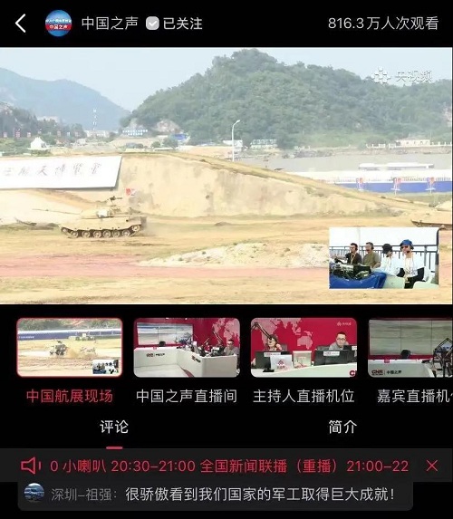 人民日報(bào)、新華社、中國日報(bào)、共青團(tuán)中央、國資小新、騰訊軍事、鳳凰軍事、新浪軍事等新媒體發(fā)布的集團(tuán)公司航展宣傳片等視頻作品燃爆全網(wǎng),閱讀量突破三千萬人次,得到外交部發(fā)言人趙立堅(jiān)轉(zhuǎn)載點(diǎn)贊。集團(tuán)公司微信、微博、抖音號、微信視頻號等新媒體宣傳片播放閱讀量超過400萬人次。同時(shí),央視新聞、新華社、中國之聲、央視軍事、央視新媒體、解放軍報(bào)、共青團(tuán)中央、國資小新、環(huán)球時(shí)報(bào)等多家媒體對集團(tuán)公司靜、動態(tài)展區(qū)進(jìn)行現(xiàn)場直播,在電視端、客戶端、微信視頻號、微博、B站、快手、抖音等平臺受到高度關(guān)注。著名軍事專家杜文龍、央視主持人顧國寧、央廣中國之聲主持人王藝等直播兵器館、動態(tài)表演區(qū)裝備。 《參考消息》、新華網(wǎng)、央廣網(wǎng)、中國日報(bào)、科技日報(bào)、解放軍報(bào)、人民網(wǎng)、中國新聞網(wǎng)、中國青年網(wǎng)、中國網(wǎng)、中工網(wǎng)、央視網(wǎng)、環(huán)球網(wǎng)、騰訊網(wǎng)、新浪網(wǎng)、鳳凰網(wǎng)、搜狐網(wǎng)、網(wǎng)易網(wǎng)、今日頭條等中央主流媒體和知名網(wǎng)絡(luò)媒體以及南方日報(bào)、廣東電視臺、北京電視臺、新京報(bào)、珠海傳媒集團(tuán)、深圳衛(wèi)視等省市媒體對集團(tuán)公司參展情況進(jìn)行了圖片、文字、視頻報(bào)道。 航展期間,備受關(guān)注的中國兵器館,參觀的觀眾絡(luò)繹不絕。 |