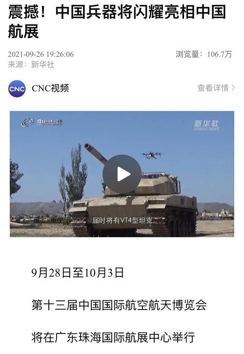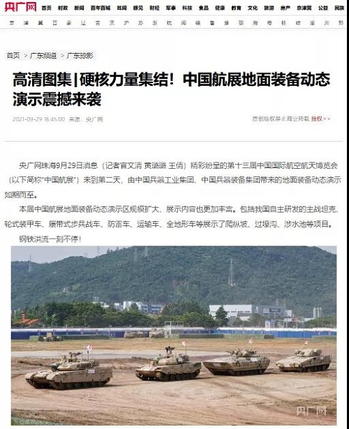 9月28日-10月3日,第十三屆中國國際航空航天博覽會在廣東珠海舉行,中國兵器工業(yè)集團(tuán)有限公司作為主辦單位閃耀亮相,推出裝甲突擊、火力打擊、智能彈藥、防空反導(dǎo)、無人裝備、非傳統(tǒng)安全、軍工軍技合作等領(lǐng)域新產(chǎn)品及成體系成建制武器系統(tǒng)和解決方案,全方位展示我國陸軍外貿(mào)武器裝備的最高水平以及雄厚的科技創(chuàng)新、自主研發(fā)與先進(jìn)制造能力,受到廣泛關(guān)注。 央視《新聞聯(lián)播》報(bào)道第十三屆中國航展,著重介紹了VT4主戰(zhàn)坦克,關(guān)注航展公眾日中國兵器館情況。9月28日下午央視《新聞直播間》航展特別節(jié)目《藍(lán)天盛會》邀請集團(tuán)公司訪談嘉賓做客直播間對中國兵器館兵器工業(yè)集團(tuán)展區(qū)等進(jìn)行1小時(shí)直播;9月28日下午、10月2日下午分別對地面裝備動態(tài)表演進(jìn)行兩場直播。央視《朝聞天下》、《新聞直播間》、《共同關(guān)注》、《天下財(cái)經(jīng)》、《軍事報(bào)道》、《正午國防軍事》、《軍武零距離》等相繼推出集團(tuán)公司參展裝備的報(bào)道。