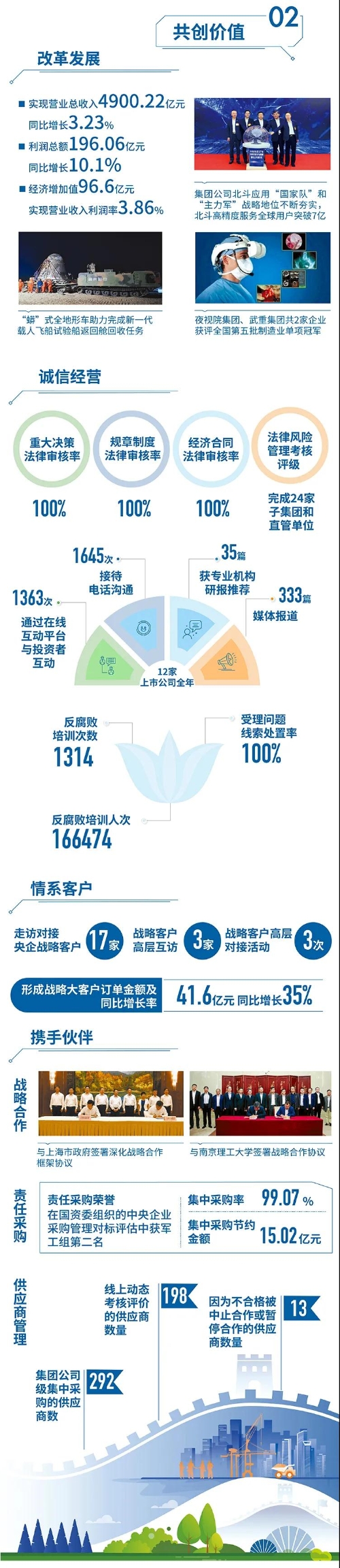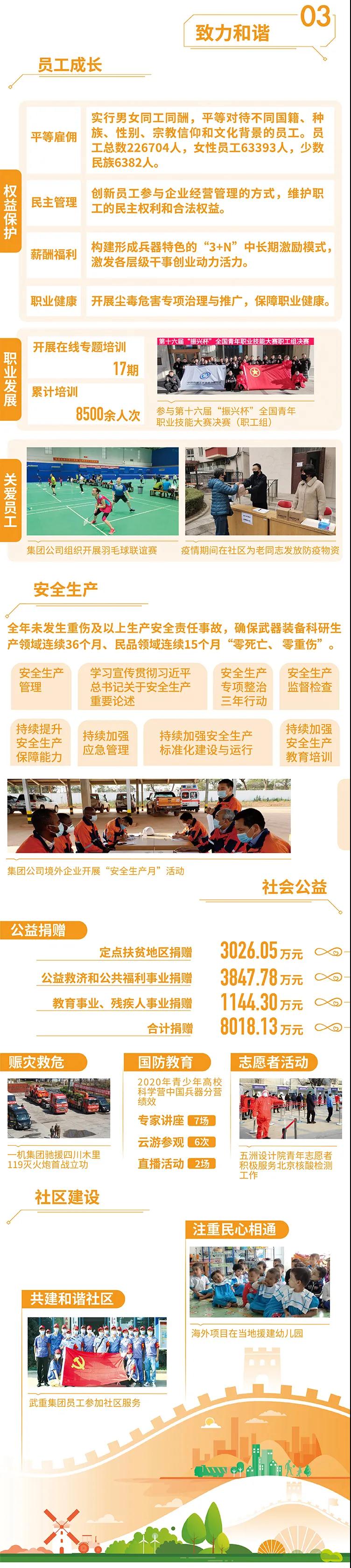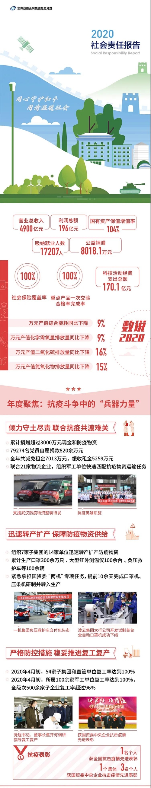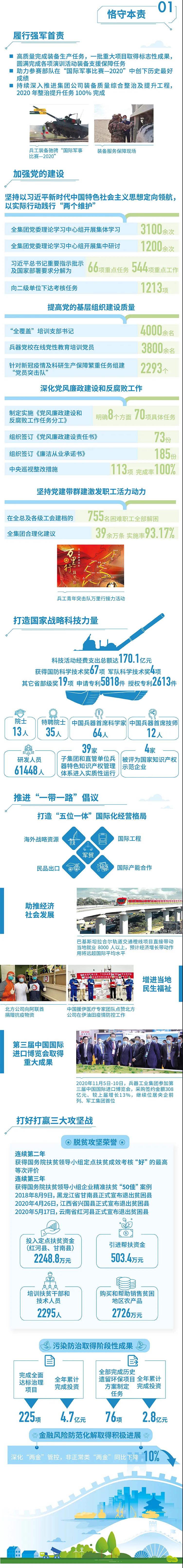 2020年,是“十三五”規(guī)劃收官之年,也是全面建成小康社會、實現(xiàn)第一個百年目標的決勝之年。集團公司黨組書記、董事長焦開河在報告開篇指出,集團公司實現(xiàn)了“十三五”圓滿收官,整體步入了高質(zhì)量發(fā)展軌道,呈現(xiàn)出基礎(chǔ)更牢、動力更強、空間更大、效能更高的積極向上良好態(tài)勢。在“十三五”特別是近三年來的工作實踐中,我們明確了“集團公司是國家安全和國防建設(shè)的脊梁、是國家戰(zhàn)略科技力量最為重要的組成部分、是黨和國家最可信賴的‘六個力量’,肩負著支撐國防軍隊建設(shè)、推動科技自立自強、服務(wù)構(gòu)建新發(fā)展格局的重大政治責任和光榮使命,具有極強的政治屬性,性質(zhì)特殊、使命特殊、責任特殊”的新時代新階段職責使命,深化了對“堅持以習近平新時代中國特色社會主義思想定向領(lǐng)航,是集團公司高質(zhì)量發(fā)展的根本遵循;保持貫徹落實習近平總書記重要指示批示和黨中央決策部署的戰(zhàn)略定力,是集團公司高質(zhì)量發(fā)展的根本前提;履行好強軍這個首要職責,是集團公司高質(zhì)量發(fā)展的根本要求;加快兵器科技創(chuàng)新突破,是集團公司高質(zhì)量發(fā)展的根本支撐;加強黨的領(lǐng)導黨的建設(shè),是集團公司高質(zhì)量發(fā)展的根本保證”的兵器工業(yè)改革發(fā)展規(guī)律認識。 《報告》聚焦“抗疫斗爭中的‘兵器力量’”,生動展示了集團公司抗擊疫情的有力行動,展現(xiàn)了集中力量辦大事、急國家之所急的“兵器速度”,彰顯了“把一切獻給黨”的人民兵工精神和貫徹落實國家決策部署的責任擔當?!秷蟾妗芬浴坝眯氖睾蚝推?、用情溫暖社會”為主題,從恪守本責、共創(chuàng)價值、致力和諧、踐行綠色、責任管理五個維度,全面展現(xiàn)集團公司在堅持履行政治責任、經(jīng)濟責任、社會責任,履行強軍首責、加強黨的建設(shè)、打造國家戰(zhàn)略科技力量、推進“一帶一路”倡議、打好打贏三大攻堅戰(zhàn)、深化改革、助力員工成長、支持社會公益事業(yè)、提升社會責任管理等方面的生動實踐和履責亮點,凸顯集團公司保持貫徹落實黨中央決策部署的戰(zhàn)略定力、在聚焦主責主業(yè)、科技引領(lǐng)、國際化經(jīng)營上持續(xù)用力,為實現(xiàn)第一個百年奮斗目標貢獻力量的初心與行動?!秷蟾妗吩俅潍@得中國企業(yè)社會責任報告評級專家委員會“五星佳”最高評級,兵器工業(yè)集團成為軍工行業(yè)唯一連續(xù)10年獲得最高評級的企業(yè)。 2021年是開啟新征程的開局之年,也是建黨100周年、人民兵工創(chuàng)建90周年,兵器工業(yè)集團將全面貫徹落實黨中央戰(zhàn)略部署,緊扣推動高質(zhì)量發(fā)展主題,圍繞“十四五”開好局、起好步,堅決完成黨中央賦予的職責使命,履行好中央企業(yè)和軍工集團的政治責任、經(jīng)濟責任、社會責任,為實現(xiàn)中國夢強軍夢作出新的更大貢獻! 一圖看懂《中國兵器工業(yè)集團有限公司2020年社會責任報告》