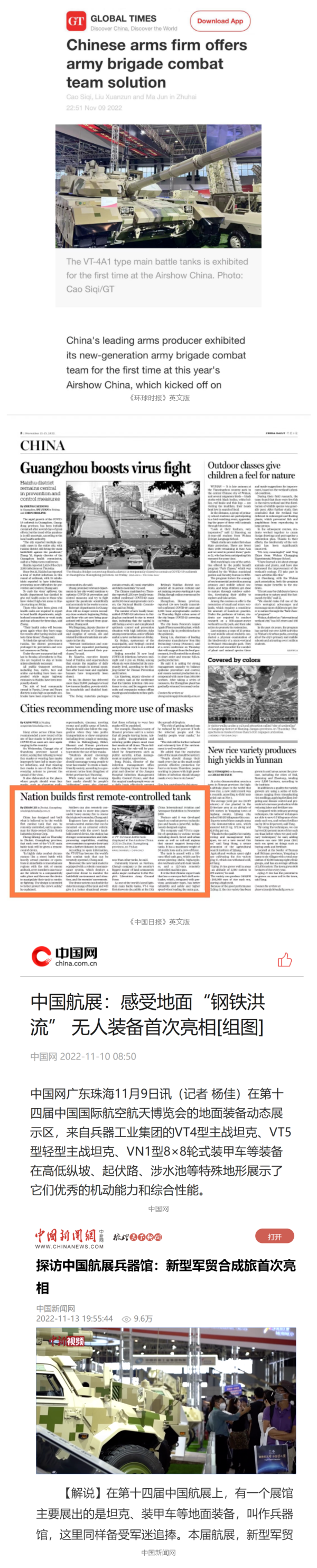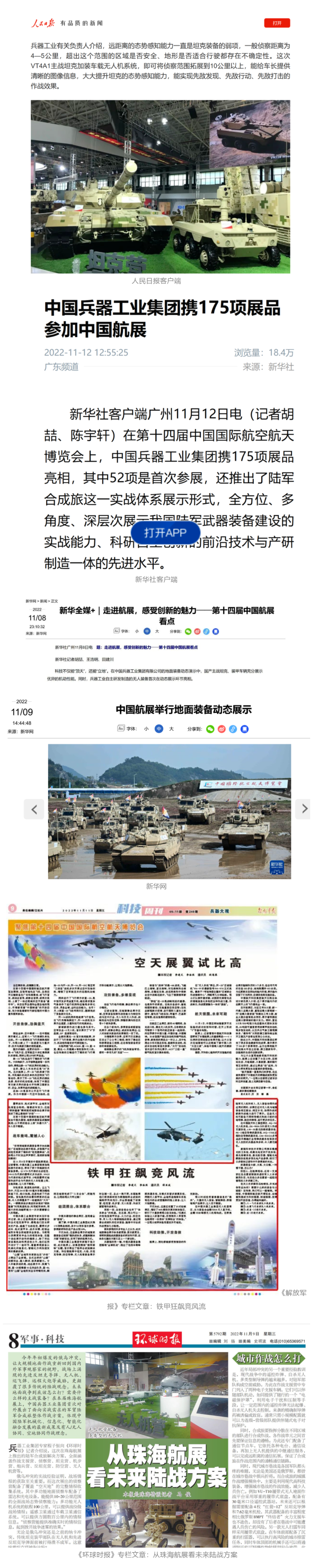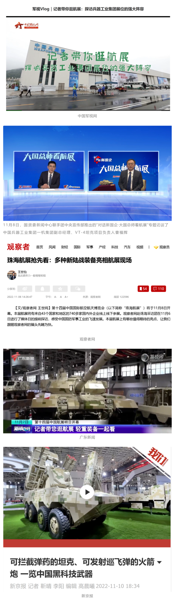 央視國防軍事頻道航展特別報(bào)道《炫舞天地間》11月12日《賞“鐵甲雄風(fēng)”!看航展地面裝備“鋼鐵洪流”名場(chǎng)面》對(duì)兵器工業(yè)集團(tuán)武器裝備特色亮點(diǎn)進(jìn)行報(bào)道。《國防軍事早報(bào)》11月7日推出報(bào)道《第十四屆中國國際航空航天博覽會(huì)明天開幕 中國兵器館首次以陸軍合成旅實(shí)戰(zhàn)體系形式展出》,對(duì)兵器館陸軍合成旅實(shí)戰(zhàn)體系進(jìn)行報(bào)道?!盾娛聢?bào)道》11月9日推出《第十四屆中國國際航空航天博覽會(huì) 地面兵器裝備首次聯(lián)合陸航直升機(jī)進(jìn)行動(dòng)態(tài)展示》報(bào)道?!盾娒孕刑煜隆?1月9日推出報(bào)道《軍迷打卡航展2022》以專業(yè)軍迷視角探館兵器館,全面展示兵器工業(yè)集團(tuán)參展裝備特色亮點(diǎn)。