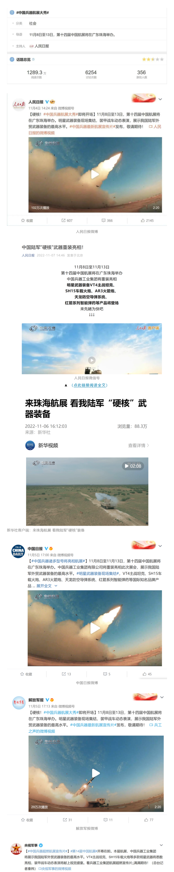 人民日?qǐng)?bào)官方微博、微信公眾號(hào),新華社客戶端、央視新聞客戶端、中國日?qǐng)?bào)微博、參考消息微信公眾號(hào)、解放軍報(bào)微博、央視軍事微博、CGTN微博、中國軍號(hào)微博、共青團(tuán)中央微博、環(huán)球時(shí)報(bào)(英文網(wǎng)站、臉書賬號(hào)、推特賬號(hào))、嗶哩嗶哩、學(xué)習(xí)強(qiáng)國平臺(tái)、國資小新視頻號(hào)、網(wǎng)易軍事、騰訊軍事、鳳凰軍事、北京日?qǐng)?bào)、東方衛(wèi)視看看新聞全媒體、北京電視臺(tái)等20余家中央主流媒體、國家部委、省市媒體的新媒體第一時(shí)間播發(fā)集團(tuán)公司航展宣傳片等視頻作品燃爆全網(wǎng),累計(jì)閱讀量突破1700萬人次。集團(tuán)公司微信公眾號(hào)、微博、抖音號(hào)、快手號(hào)、微信視頻號(hào)、知乎號(hào)等新媒體宣傳片播放閱讀量超過800萬人次,點(diǎn)贊超過30萬人次。集團(tuán)公司微信公眾號(hào)推出《硬核!中國兵器最新航展宣傳片發(fā)布》《中國兵器航展節(jié)目單,請(qǐng)選出心中明星裝備》《航展首日,中國兵器閃耀亮相!》等7篇報(bào)道,閱讀量超過25萬人次,集團(tuán)公司微信視頻號(hào)、抖音號(hào)、快手號(hào)等新媒體賬號(hào)發(fā)布“中國兵器航展大秀”系列視頻,觀看量超過330萬人次。