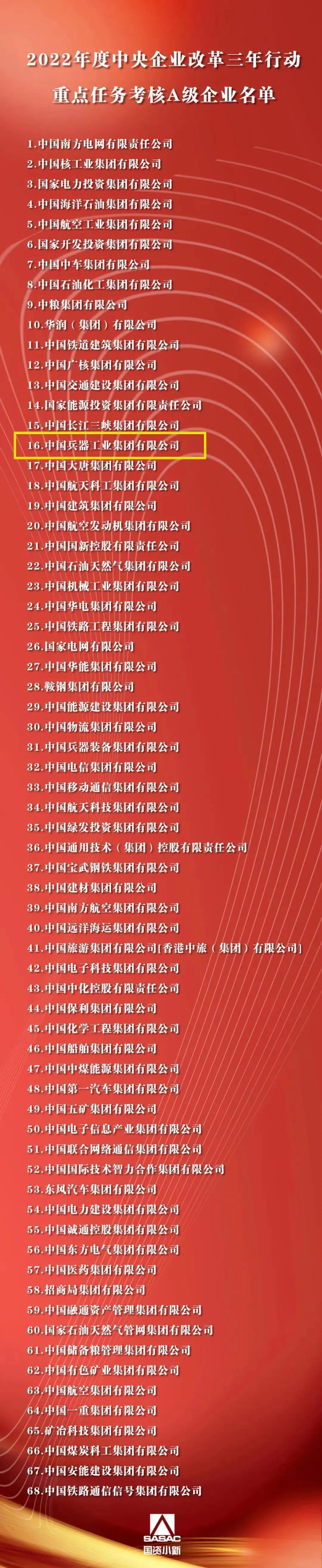 根據(jù)《中央企業(yè)改革三年行動(dòng)重點(diǎn)任務(wù)考核實(shí)施方案(試行)》和《中央企業(yè)改革三年行動(dòng)重點(diǎn)任務(wù)考核指標(biāo)表(2022版)》,經(jīng)審定,國(guó)務(wù)院國(guó)資委發(fā)布2022年度中央企業(yè)改革三年行動(dòng)重點(diǎn)任務(wù)考核A級(jí)企業(yè)名單,中國(guó)兵器工業(yè)集團(tuán)有限公司獲評(píng)A級(jí)。 來(lái)源/國(guó)資委網(wǎng)站 |