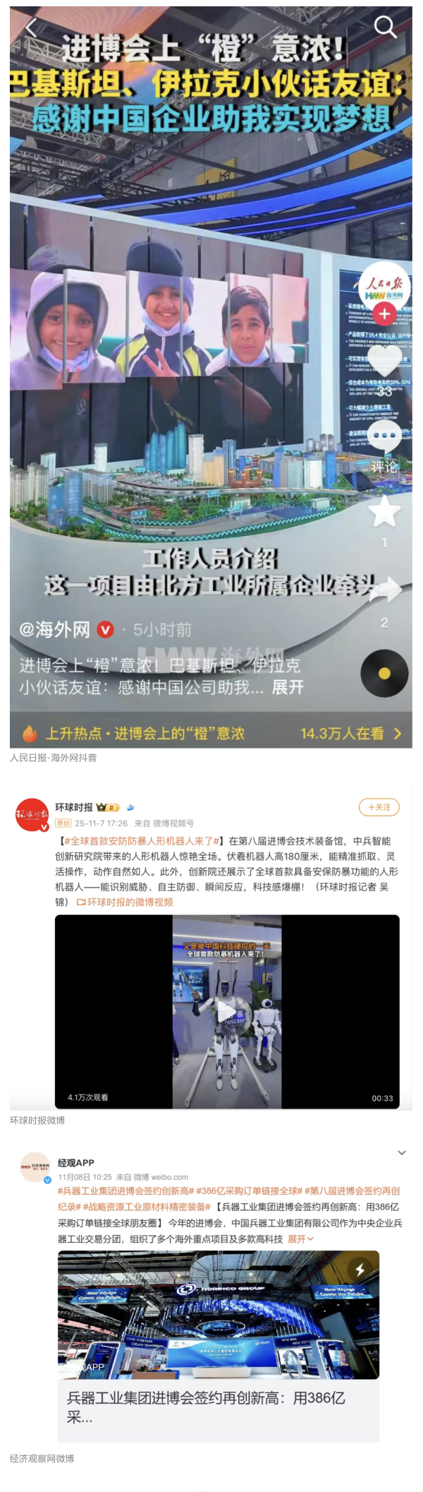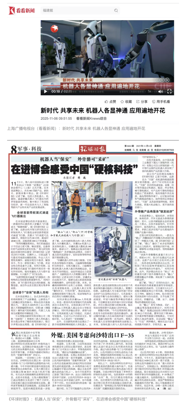 11月5日至10日,中國(guó)兵器工業(yè)集團(tuán)有限公司組團(tuán)參加第八屆中國(guó)國(guó)際進(jìn)口博覽會(huì)。集團(tuán)公司以“堅(jiān)持合作共贏,推進(jìn)高水平對(duì)外開(kāi)放,助力構(gòu)建新發(fā)展格局”為目標(biāo),圍繞“新征程,共創(chuàng)未來(lái)”主題組團(tuán)參展,集中展示了一系列新技術(shù)、新理念、新成果,取得豐碩成果,受到廣泛關(guān)注。 嘉賓云集 本屆進(jìn)博會(huì)上,蒙古國(guó)駐華大使、贊比亞礦業(yè)和礦產(chǎn)開(kāi)發(fā)部常任秘書(shū)、津巴布韋首席司長(zhǎng)等多國(guó)政要蒞臨集團(tuán)公司組展展區(qū),了解有關(guān)項(xiàng)目情況。 國(guó)家能源集團(tuán)、東風(fēng)汽車(chē)、哈電集團(tuán)、鞍鋼集團(tuán)、中鋁集團(tuán)、通用技術(shù)集團(tuán)、中國(guó)中車(chē)、中國(guó)長(zhǎng)安汽車(chē)、中國(guó)電建等央企領(lǐng)導(dǎo),工信部、國(guó)務(wù)院國(guó)資委、中國(guó)貿(mào)促會(huì)、陜西省、上海市、浙江省等國(guó)內(nèi)政府部門(mén)領(lǐng)導(dǎo)以及國(guó)內(nèi)外合作伙伴蒞臨集團(tuán)公司組展展區(qū)參觀指導(dǎo)。對(duì)集團(tuán)公司高質(zhì)量共建“一帶一路”,與各國(guó)合作伙伴共享發(fā)展機(jī)遇、實(shí)現(xiàn)互利共贏給予高度評(píng)價(jià)。 媒體關(guān)注 集團(tuán)公司集中簽約亮相央視綜合頻道《新聞聯(lián)播》、央視新聞?lì)l道《朝聞天下》《新聞30分》《共同關(guān)注》、央視財(cái)經(jīng)頻道《正點(diǎn)財(cái)經(jīng)》《經(jīng)濟(jì)信息聯(lián)播》。 《環(huán)球時(shí)報(bào)》、環(huán)球網(wǎng)、《新京報(bào)》、《中國(guó)旅游報(bào)》等對(duì)集團(tuán)公司人形機(jī)器人、四足機(jī)器人、涵道穿戴式載人飛行器、外骨骼等多型新域新質(zhì)產(chǎn)品,集中亮相進(jìn)行報(bào)道。新華社、央廣中國(guó)之聲、新京報(bào)(貝殼財(cái)經(jīng))、上海廣播電視臺(tái)等媒體直播探館,打卡兵器“硬核科技”。 人民日?qǐng)?bào)客戶(hù)端、新華社客戶(hù)端、人民網(wǎng)、中國(guó)網(wǎng)、中國(guó)日?qǐng)?bào)網(wǎng)、國(guó)務(wù)院國(guó)資委網(wǎng)站、國(guó)資小新微信公眾號(hào)、國(guó)資小新Facebook、學(xué)習(xí)強(qiáng)國(guó)中央企業(yè)學(xué)習(xí)平臺(tái)、經(jīng)濟(jì)觀察網(wǎng)、新京報(bào)客戶(hù)端等第一時(shí)間刊發(fā)集團(tuán)公司組展簽約、ESG建設(shè)等情況。新浪財(cái)經(jīng)、界面新聞等商業(yè)平臺(tái)閱讀量累計(jì)超500萬(wàn)次。 在微博、抖音等新媒體平臺(tái)上,集團(tuán)公司高科技產(chǎn)品演示、5D穹幕電影體驗(yàn)等短視頻持續(xù)引爆流量,累計(jì)播放量超800萬(wàn)次,點(diǎn)贊量破50萬(wàn)。“兵器工業(yè)集團(tuán)進(jìn)博會(huì)簽約386億”相關(guān)話(huà)題登上微博熱搜榜,閱讀量破5000萬(wàn)次。 文字丨劉暢 |