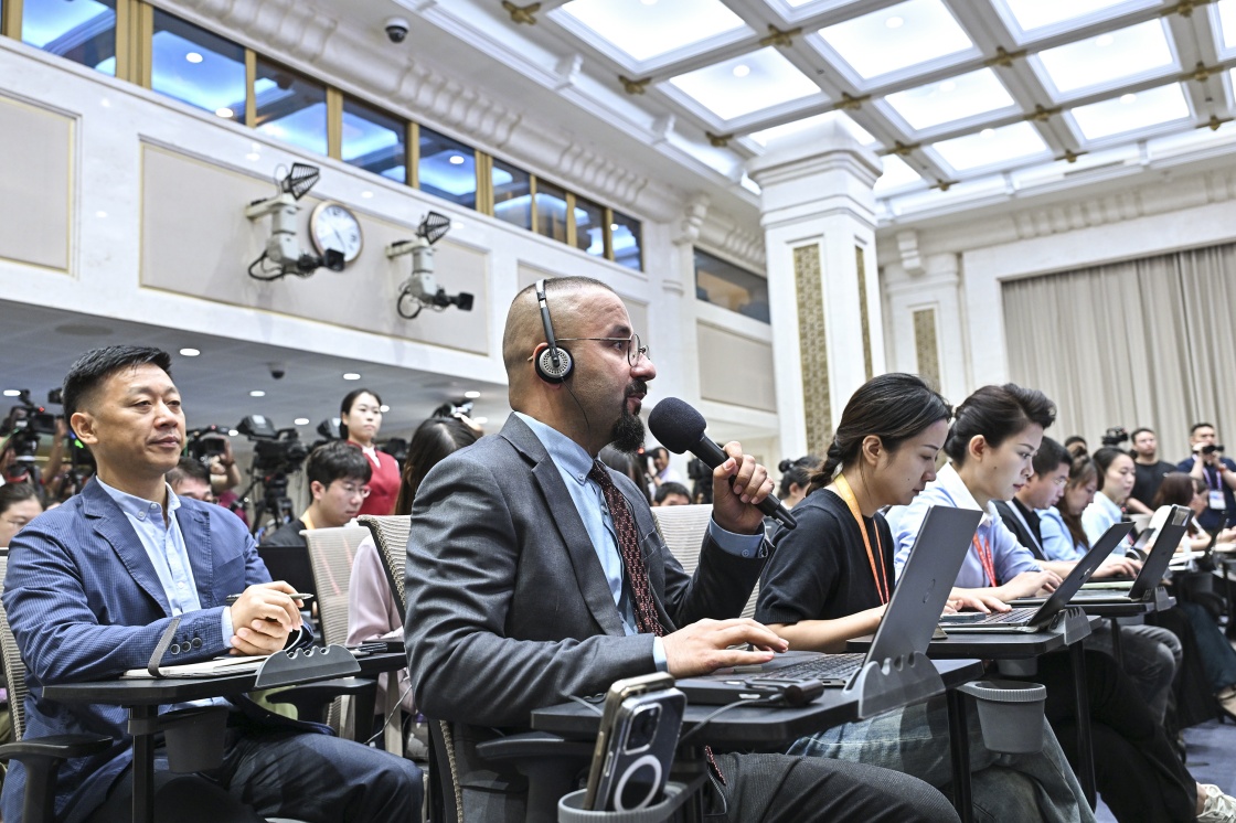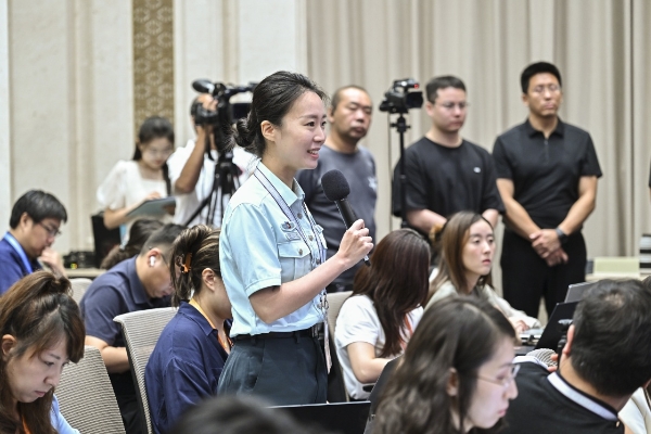 8月20日,國務(wù)院新聞辦公室在北京舉行新聞發(fā)布會(huì),閱兵領(lǐng)導(dǎo)小組辦公室副主任、中央軍委聯(lián)合參謀部作戰(zhàn)局少將副局長吳澤棵,中國人民解放軍中部戰(zhàn)區(qū)閱兵指揮機(jī)構(gòu)辦公室常務(wù)副主任、政治工作部少將副主任徐貴忠介紹閱兵準(zhǔn)備工作有關(guān)情況,并答記者問。這是記者在現(xiàn)場提問。